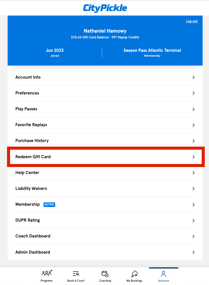Your gift card balance can be used to pay for any programming or court reservations made on our app at any location. It cannot be used to pay for food and beverage, merchandise, or coaching fees. Additionally, gift card credit cannot be used retroactively for bookings made in the past.